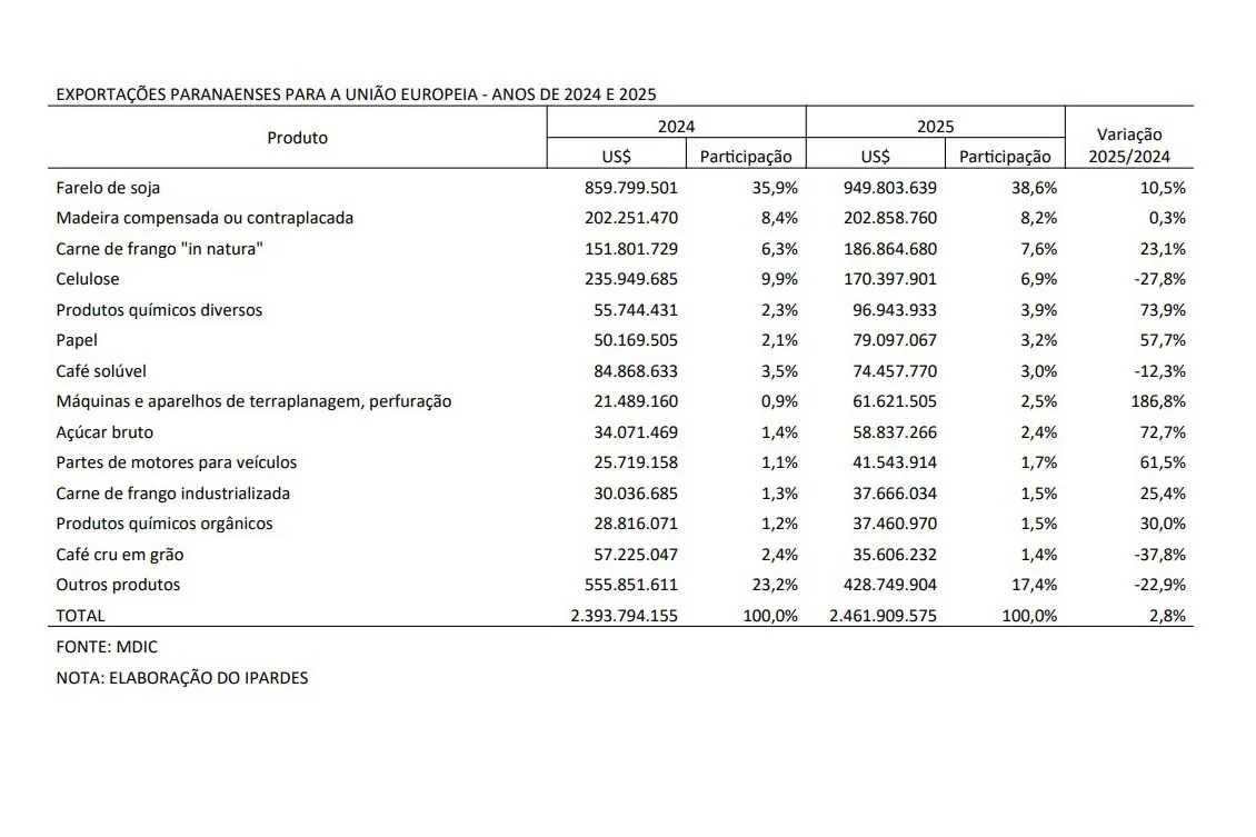Em 2025, as exportações do Paraná para a União Europeia alcançaram a marca de US$ 2,46 bilhões, o que representa 10,4% do total das vendas do estado ao exterior, conforme dados do Ministério do Desenvolvimento, Indústria, Comércio e Serviços (MDIC). Esse valor superou as exportações para países como Argentina (US$ 1,83 bilhão), Estados Unidos (US$ 1,21 bilhão) e México (US$ 890 milhões), evidenciando a relevância do mercado europeu para a economia paranaense.
