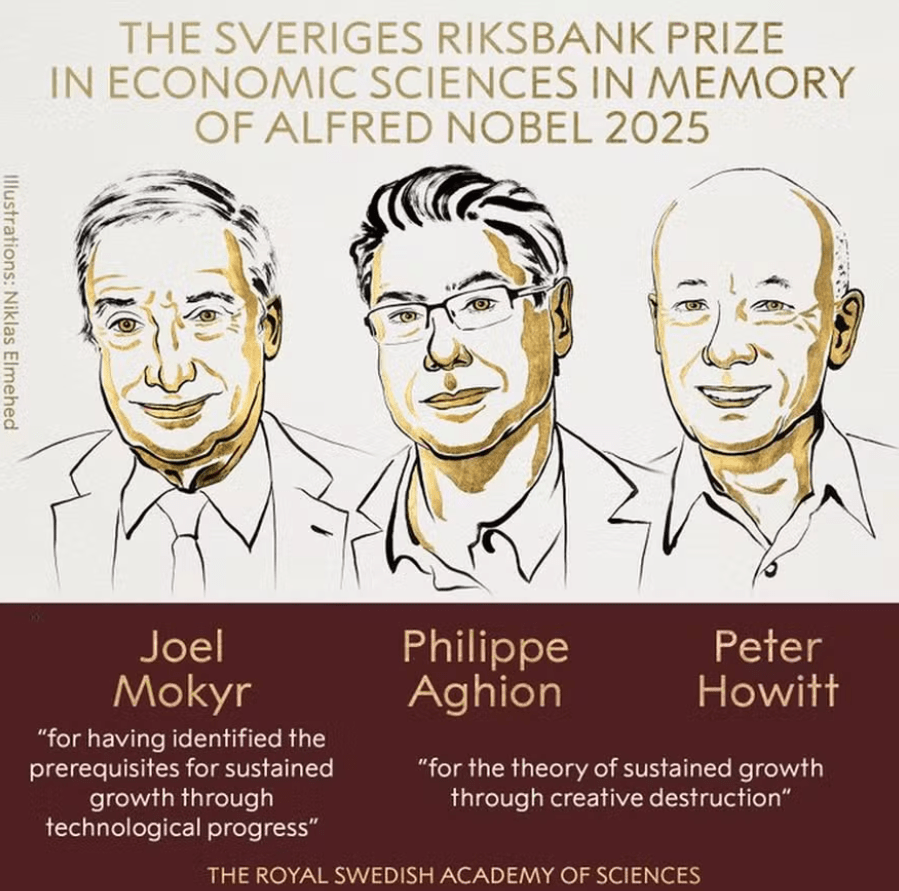 A Real Academia Sueca de Ciências anunciou nesta segunda-feira (13) os ganhadores do Prêmio Sveriges Riksbank em Ciências Econômicas em Memória de Alfred Nobel de 2025. Os laureados são Joel Mokyr, Philippe Aghion e Peter Howitt, reconhecidos por suas contribuições significativas à compreensão do crescimento econômico impulsionado pela inovação, conforme destacado pelo comitê do prêmio.